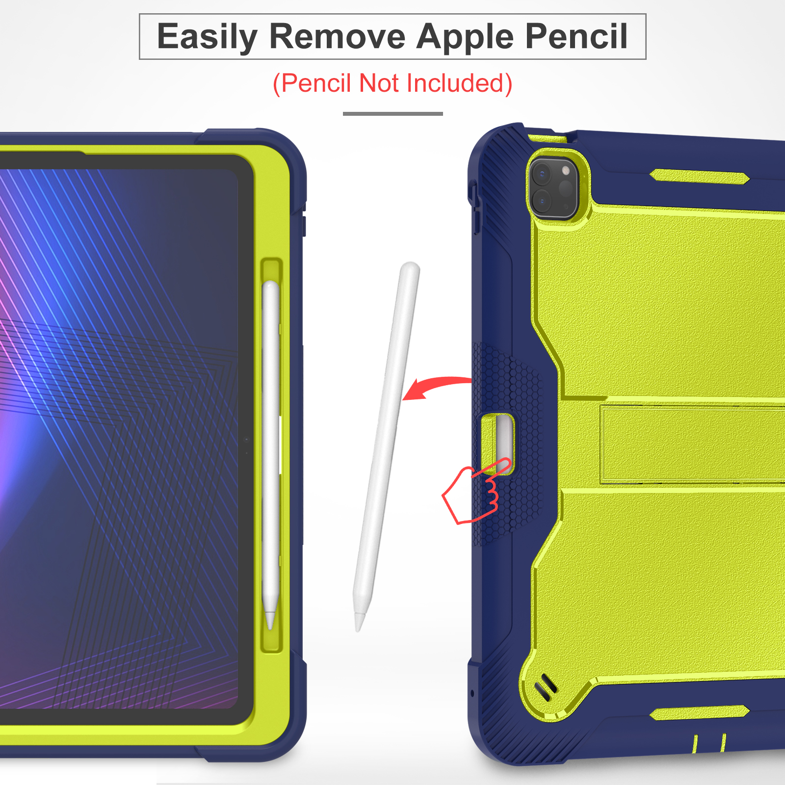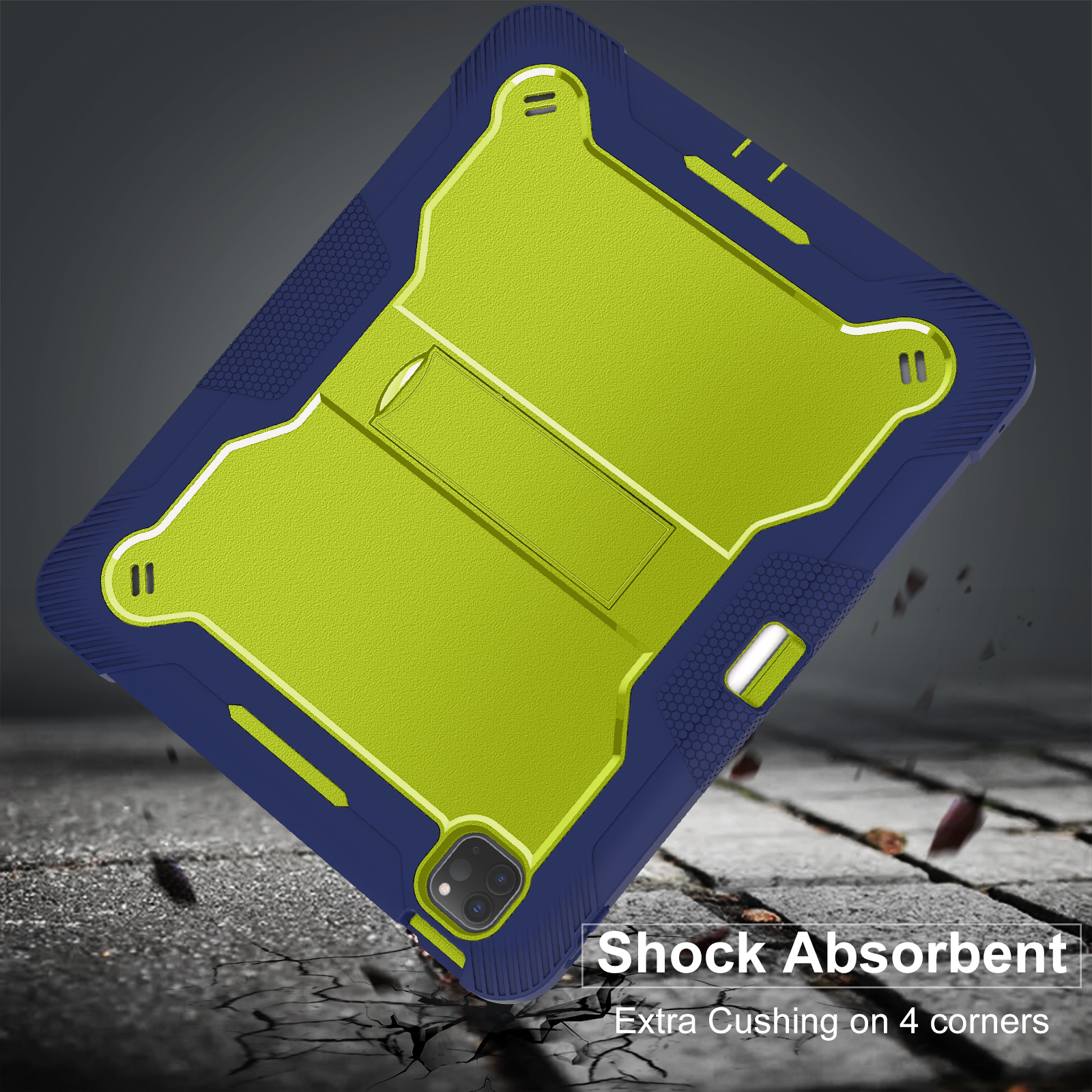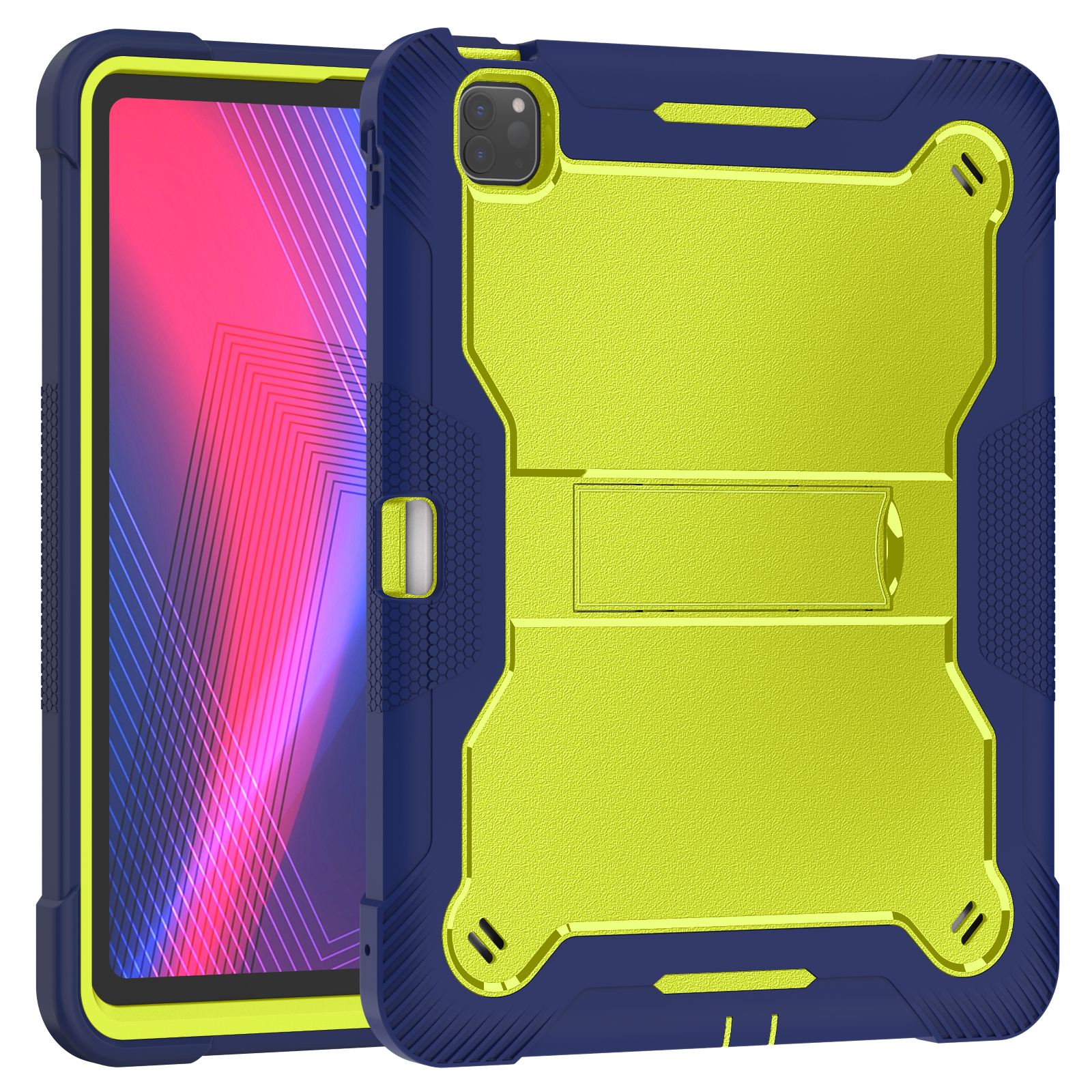 Eye-catching yellow & navy school-ready case for iPad Pro 13 (2024/2025). 3-layer kid-friendly shockproof armor with kickstand and certified safety.