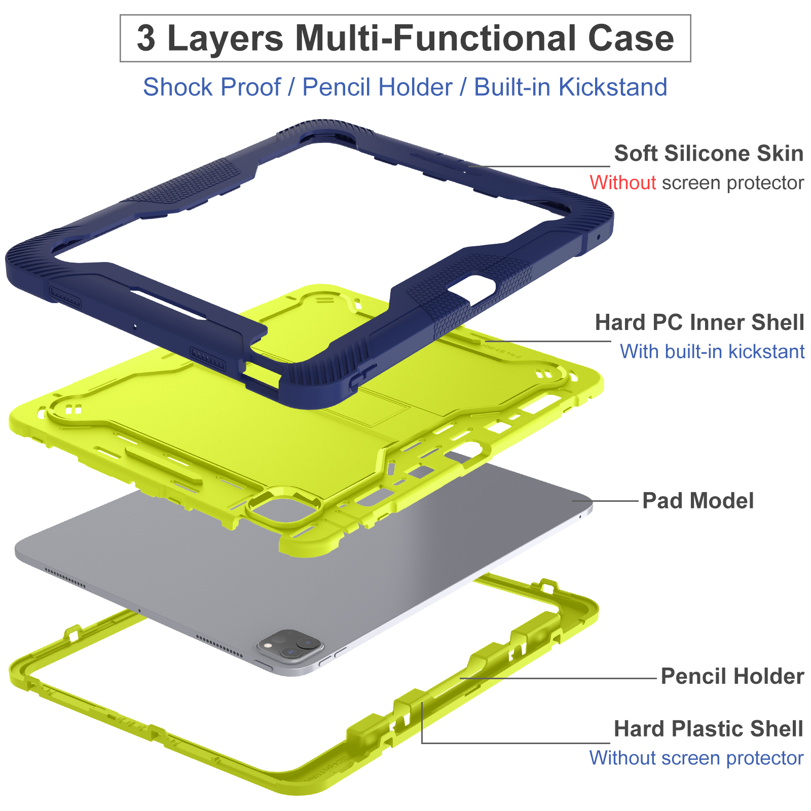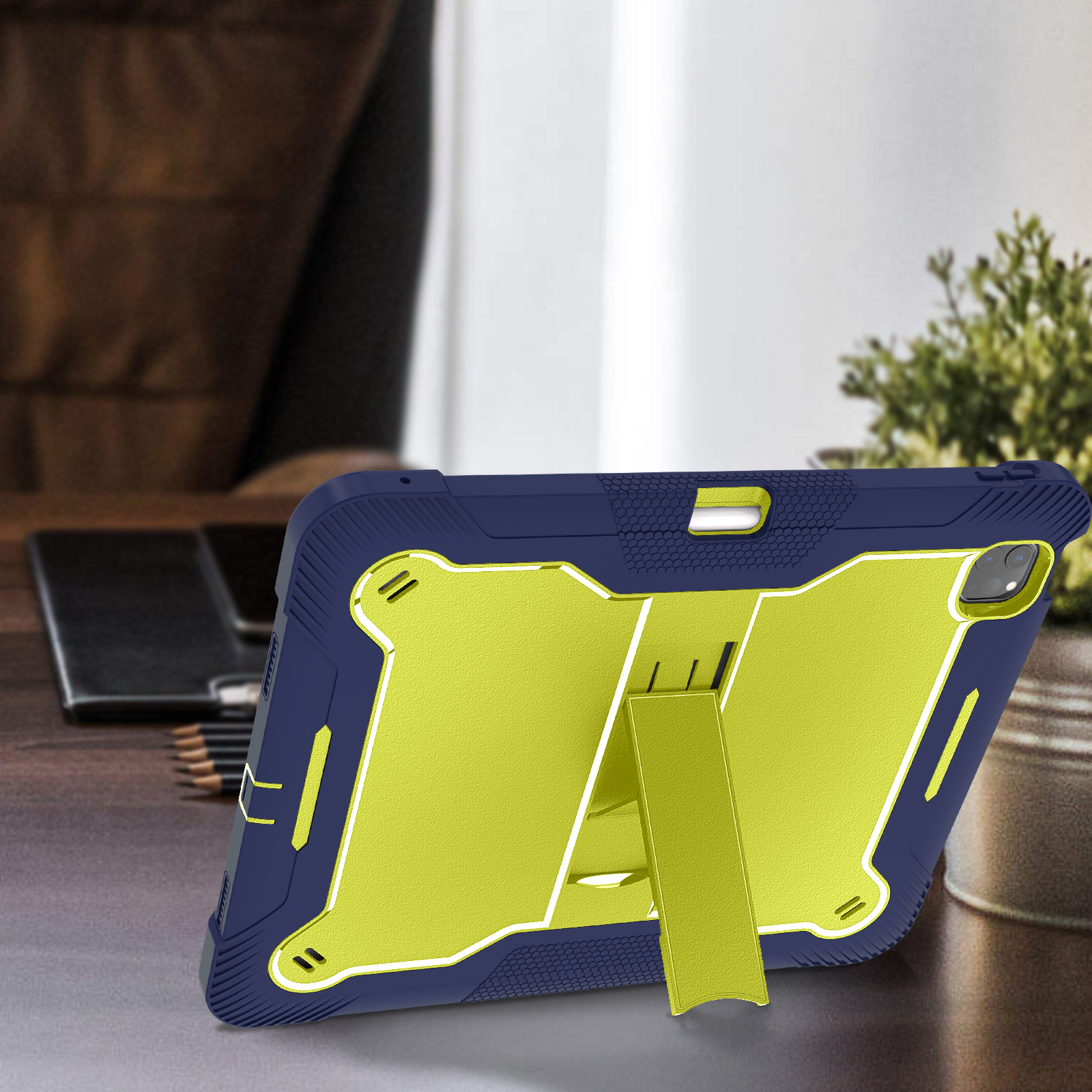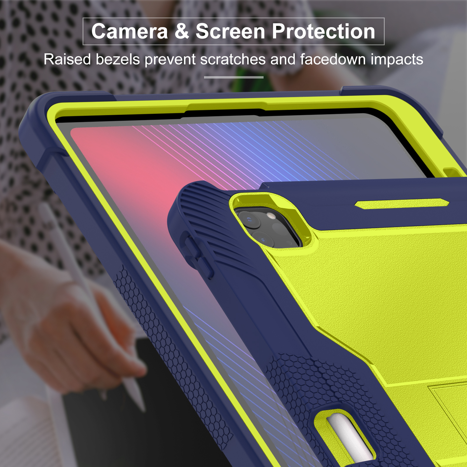 Eye-catching yellow & navy school-ready case for iPad Pro 13 (2024/2025). 3-layer kid-friendly shockproof armor with kickstand and certified safety.