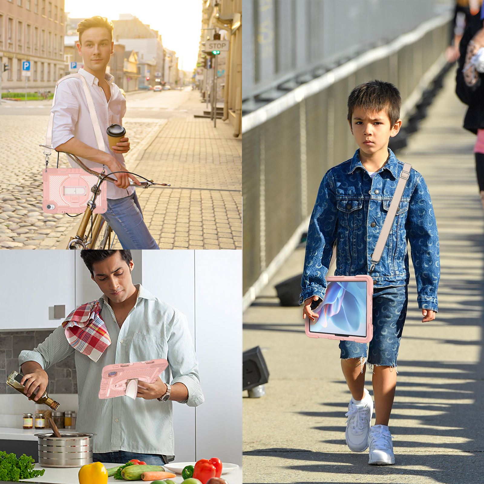 Chic pink triple-layer tablet case for Huawei Matepad 11.5 with 360° rotatable stand, anti-slip grip, and shoulder strap.