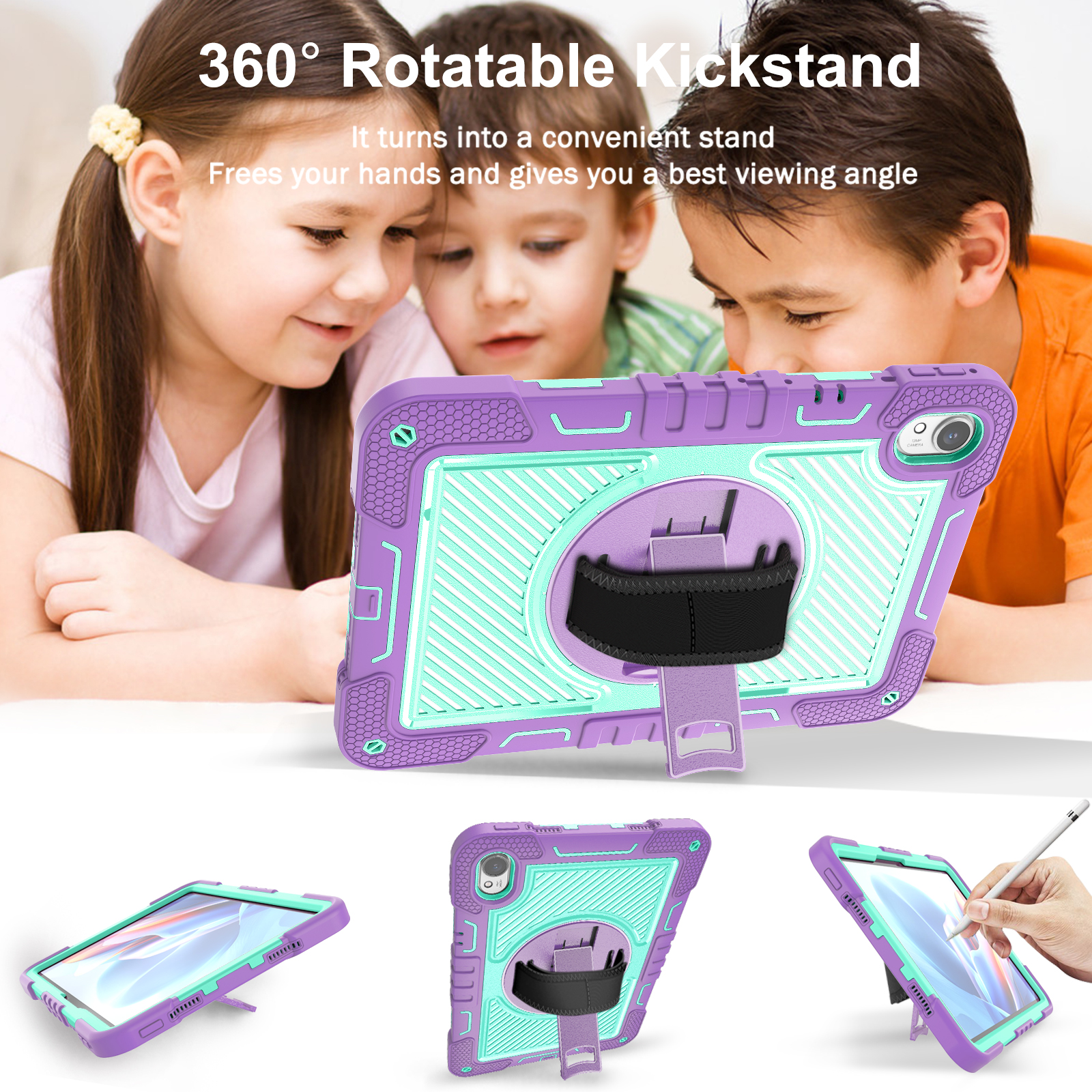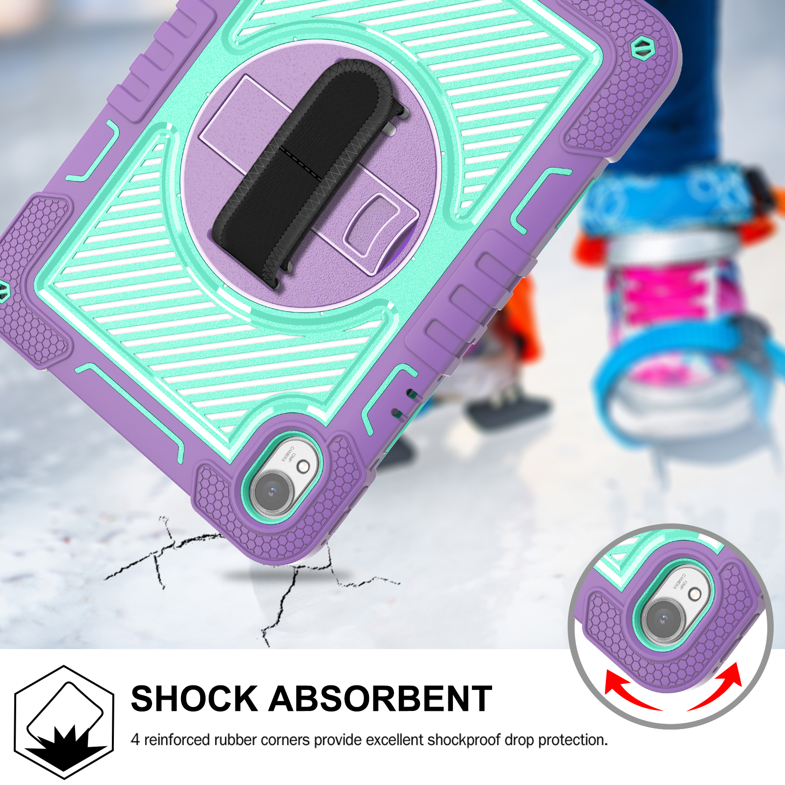 Stylish purple and mint green case for Huawei Matepad 11.5, featuring 360° rotatable stand, triple-layer shockproof structure, and shoulder strap.