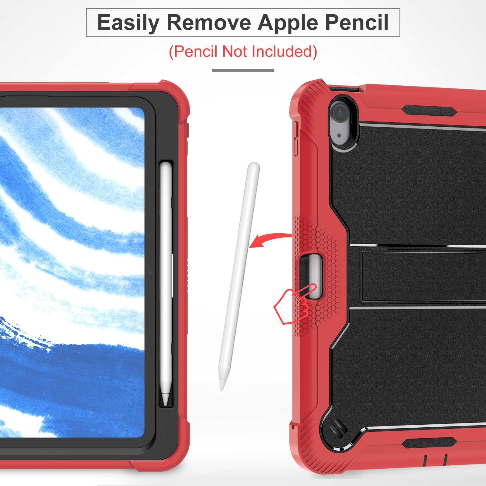 Red+Black rugged tablet case for iPad Air 11-inch M4 (2026). 3-layer PC+silicone full-body protection, anti-slip grip, precise cutouts, and built-in multi-angle kickstand—ideal for kids, school and work.